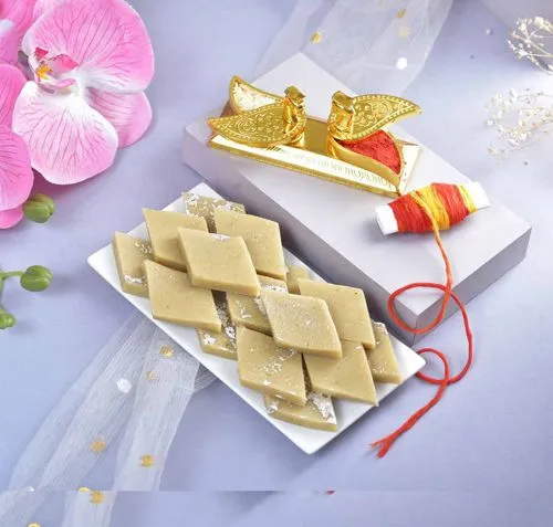 For a celebration steeped in tradition and sweetness, the Sweet Simplicity Bhai Dooj Hamper is the ideal gift. This hamper features a delectable Chhappan Bhog Kaju Katli CD Box (200g), offering a classic festive treat your brother will relish. Accompanying this sweet delight is a traditional Roli Chawal Chopra with Kalawa, allowing you to perform the Bhai Dooj rituals with grace. This simple yet elegant hamper comes with a Bhai Dooj Message Card, adding a personal touch to convey your heartfelt wishes on this special occasion. Perfect for a meaningful yet straightforward Bhai Dooj celebration.