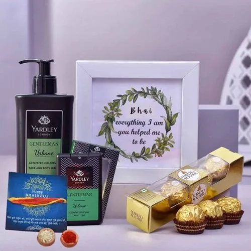 Show your brother how much you care with the thoughtfully curated Brother’s Charm Bhai Dooj Hamper. This elegant gift includes a beautiful Wooden Frame with a heartfelt message for your brother (6x6 inches), a keepsake he can treasure forever. Indulge his sweet tooth with Ferrero Rocher Chocolates (4 pcs), a deliciously decadent treat. To add a touch of luxury to his grooming routine, the hamper features Yardley London Gentleman Urbane Activated Charcoal Face N Body Wash (250 ml), and the compact yet refreshing Yardley London Gentleman Urbane Compact Perfume (18 ml). Traditional elements like Roli Tikka with Kalawa are also included for the Bhai Dooj ritual, along with a Bhai Dooj Message Card, making this a gift of love, appreciation, and tradition.