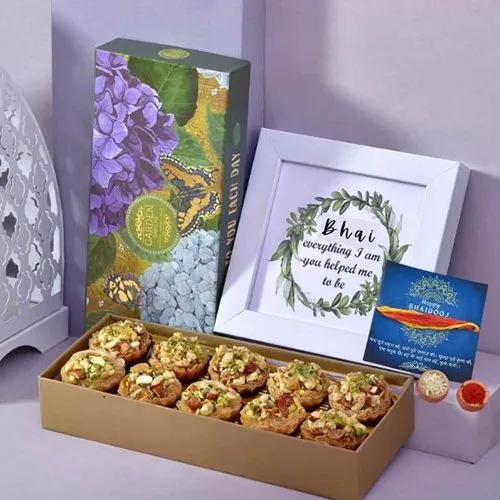 Celebrate your bond with a touch of luxury and taste with the Gourmet Love Bhai Dooj Hamper. This hamper includes a Wooden Frame with a Message for Brother (6x6 inches), a sentimental token he can cherish forever. The highlight of this gift is the Garden Bakery Tart Baklawa Box (10 pcs), offering a delicious selection of Middle Eastern sweets that will tantalize his taste buds. Traditional items like Roli Tikka with Kalawa are included to honor the rituals of Bhai Dooj, along with a thoughtful Bhai Dooj Message Card to convey your feelings of love and appreciation. A perfect gift for a brother who enjoys a mix of sentiment and indulgence.
