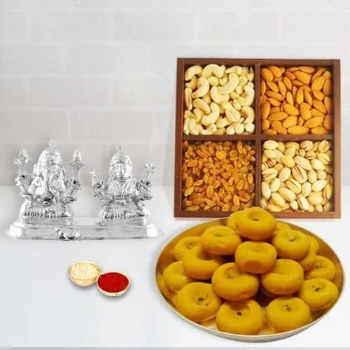 Make occasions grander with this Marvelous Sweets N Dry Fruits Combo for Bhai Dooj and share the moment with your brother on this Bhai Dooj. This Combo comprises of Silver Plated Ganesh Lakshmi Idol with Assorted Dry Fruits (250 gm) N Kesaria Peda (500 gm) along with free Roli, Tika and Chawal.