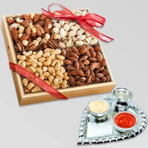 Merge your love with this Scrumptious Dry Fruits Combo and send it to your brother on this Bhai Dooj. This gift arrives with a Wooden Tray of Premium Salted Dry Fruits like Salted Almonds, Salted Peanuts, Salted Cashew n Salted Pistachio (gross wt. 500 g) along with Silver Plated Paan Shaped Pooja Thali. Free Roli, Tika and Chawal is also available with the gift item.