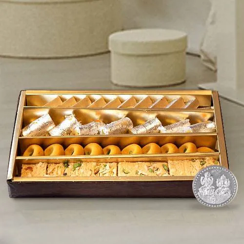 Haldirams Assorted Sweets 1 kg. in a Box with Free Silver Plated Laxmi Ganesh Coin.