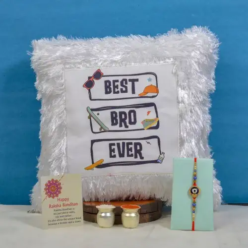 Make this Raksha Bandhan extra memorable with a charming gift set that pairs sentiment with sparkle. Featuring a dazzling Stone Studded Rakhi (Design Code: SAJ2904), this Rakhi brings grace and beauty to your celebration. Accompanied by a "Best Bro Ever" cushion cover, this gift is both thoughtful and personal, creating a keepsake your brother will cherish. With complimentary Roli Tika and Chawal to complete the ritual and a heartfelt message card, this gift set is a beautiful way to express your love and admiration.