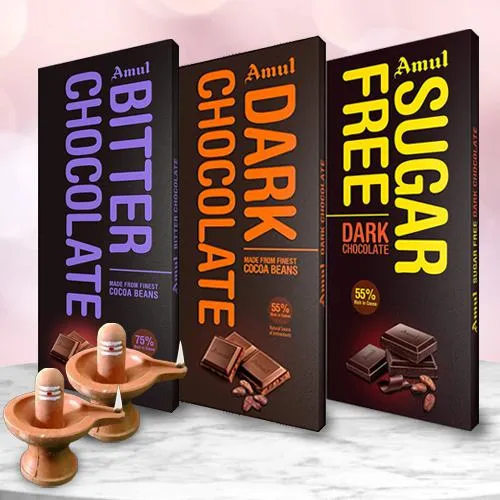 Make your dear n near ones drool with happiness on this festive day by delivering this unique Diwali Gift of Tempting Amul Dark Chocolate Delight with Pack of 2 Terracotta Diya for Temple. This Chocolate assortment contains Amul Dark Chocolate (150 g), Amul Bitter Chocolate (150 g) and Sugar Free Dark Chocolate (150 g).