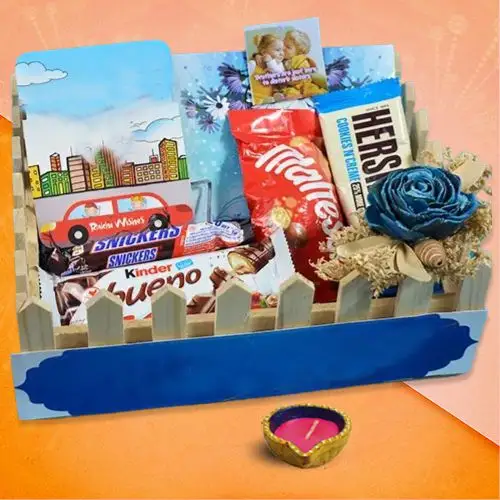 But thats not all! The Diwali Sweets: Diya And Treats Hamper is packed with delicious treats that will tantalize your taste buds. Indulge in the rich and creamy Snickers, the irresistible Kinder Bueno, and the crunchy goodness of Maltesers. And dont forget the decadent Hersheys Cookies and Cream - a delightful combination of smooth white chocolate and crunchy cookie pieces.