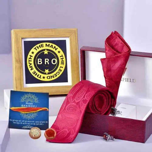 Give your brother the gift of timeless style with the Gentleman’s Style Bhai Dooj Hamper. This sophisticated gift includes a Wooden Frame with a Message for Brother (6x6 inches), perfect for adding a personal touch to his space. He will also receive a luxurious Walkfield Garnet Tie, Pocket Square, and Cufflinks Set, an elegant accessory combination that will elevate his wardrobe for any occasion. To complete the Bhai Dooj tradition, the hamper includes Roli Tikka with Kalawa, along with a heartfelt Bhai Dooj Message Card, making it the ideal blend of style and sentiment.