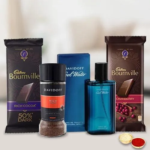 Deliver moments to cherish as you send this Bhai Dooj Gift Combo of Amusing Assortments Gift Combo to your Brother to make the celebrations a moment to cherish for life time. This Combo consists of Davidoff Coffee, Rich Aroma (100 g), Davidoff Cool Water Deodorant Natural Spray (100 ml), Cadbury Bournville Chocolate (Rich Coca-31 gm), Cadbury Bournville Chocolate (Canberry Flavour-31 gm). Free Roli, Tika and Chawal is also included with the gift item.