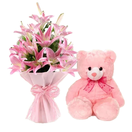 Express your emotions on Valentine's Day with this Invitation of My Heart Valentine Combo to make the day special for the person whose presence makes your every moment worth living it. An exotic Bouquet of 6 Oriental Pink Lilies and a nice 6 inch Teddy are included in this combo.